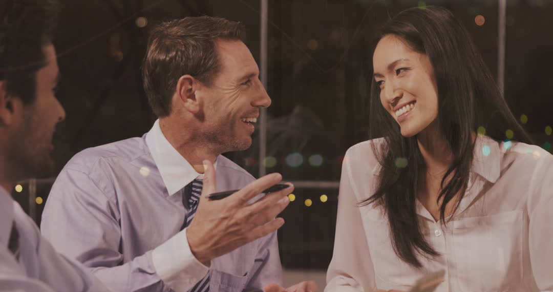 This depicts a diverse group of business professionals engaged in a lively discussion. Use it to highlight the importance of teamwork and diversity in a business environment, depicted in an evening setting, emphasizing collaboration and professional success.