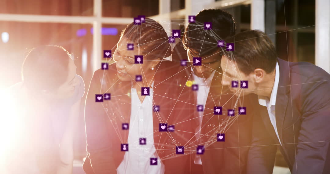 Business professionals collaborate as animated digital network symbols hover in front of them. Highlights themes of teamwork, digital transformation, and global connectivity, suitable for illustrating modern office dynamics and tech-savvy collaboration in business sleek reports, tech blogs, and promotional materials discussing innovation.