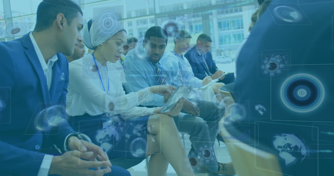 Stylized with digital data floating over business professionals, this visual represents modern technology integration and team collaboration in a professional setting. It is ideal for marketing campaigns related to tech services, global entrepreneurship, or innovation-focused articles.