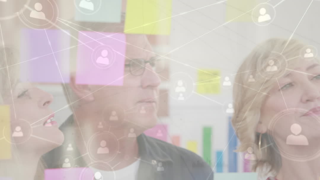 Three diverse business professionals engage in a discussion, examining colorful sticky notes on a wall. Visible overlay of digital network connection symbols suggests involvement in digital strategy or teamwork sessions. Vibrant colors-infused patterns highlight creativity and innovation. Perfect for representing concepts like business collaboration, strategic thinking, and innovative problem-solving. Ideal for use in business presentations, articles on corporate strategy, or promoting team-building exercises.