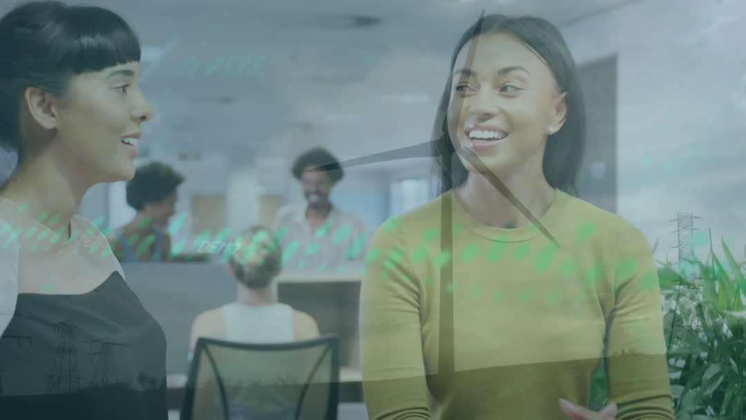 This visual shows a diverse group of business people in an office. They are discussing and collaborating on renewable energy solutions, indicated by the overlay of a wind turbine and data processing animations. It reflects modern business dynamics, technological integration, and sustainability efforts. Useful for promoting concepts of teamwork, diversity in the workplace, innovation, and clean energy initiatives.