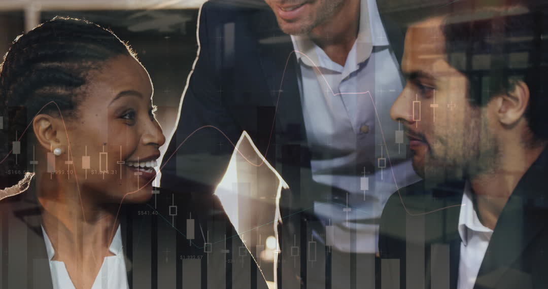 Business professionals engaged in dynamic discussion in an office environment. Financial and statistical graphs overlay enhance the theme of data-driven decision-making and analysis. This is ideal for content focusing on teamwork, data analytics, business strategy and diversity in the workplace.