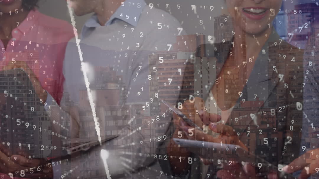 Business professionals are using digital technology while rows of digits overlay the cityscape background. Ideal for illustrating innovation in data analysis, digital transformation, or teamwork. Great for content about modern business dynamics, diversity in the workplace, and technology-driven solutions.