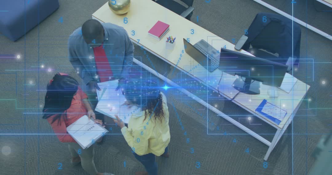 Business team engages in collaborative discussion, highlighting teamwork and innovation. Animated digital elements emphasize modern technology use in a contemporary office setting. Useful for representing themes of teamwork, professional cooperation, and business innovation in promotional materials, presentations, and corporate communications.