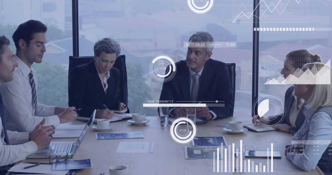 Group of business professionals sitting around table, discussing financial data and strategy. The digital graphics overlay represents modern technology use in business presentations, highlighting data integration and sophisticated analytics. Suitable for illustrating technology integration in business, diversity in corporate environments, and contemporary boardroom settings.