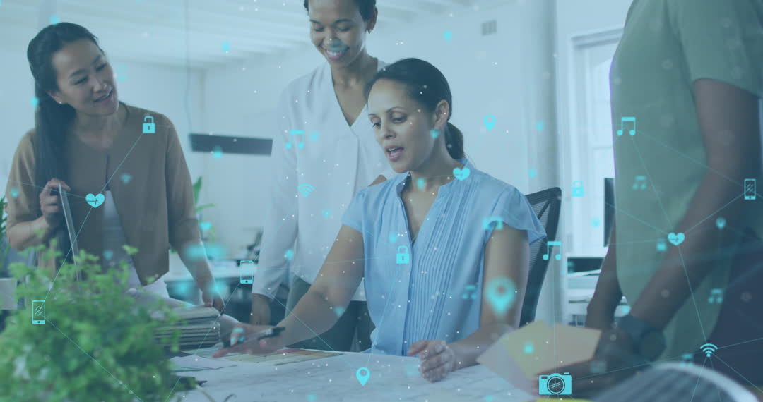 Group of diverse colleagues collaborating on a project with digital technology icons hovering over them. Suitable for illustrating modern office environments, teamwork, technology use in business, and global networking concepts.