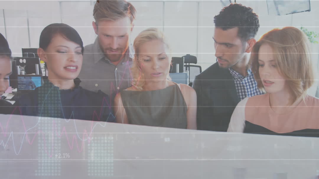 A diverse team of professionals is gathered around in an office, actively engaged in examining financial reports displayed on a translucent screen, symbolizing modern technology and collaboration in business settings. This video is ideal for illustrating concepts related to corporate teamwork, financial analysis, and strategizing in modern business environments. Suitable for use in articles, presentations, or websites focusing on business management, data-driven decision making, and team collaboration.