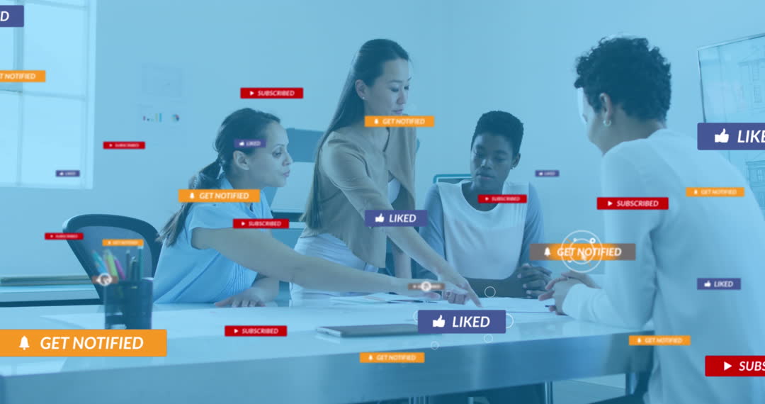 Diverse team engages in strategy meeting focused on digital and social media strategies. Social media icons like 'subscribed' and 'liked' indicate tech-savvy corporate culture. Ideal for content involving business communication, digital strategy seminars, teamwork coordination, social media marketing, and collaborative planning.