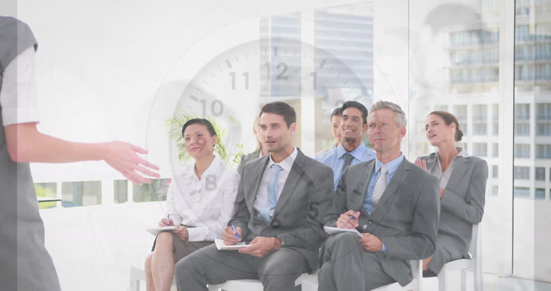 Group of business professionals sitting in a modern office, taking notes during a corporate strategy session. Digital elements suggest a focus on time management and data processing, advantageous for presentations about efficiency, team collaboration, or time-sensitive projects in business environments.