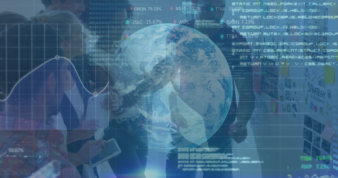 Image portrays a diverse business team interacting with digital technology, graphs, and a glowing Earth, symbolizing global collaboration and data integration. Useful for illustrating concepts related to technology-driven businesses, innovation, data analysis, and globalization in marketing materials, articles, and presentations about multinational cooperation.