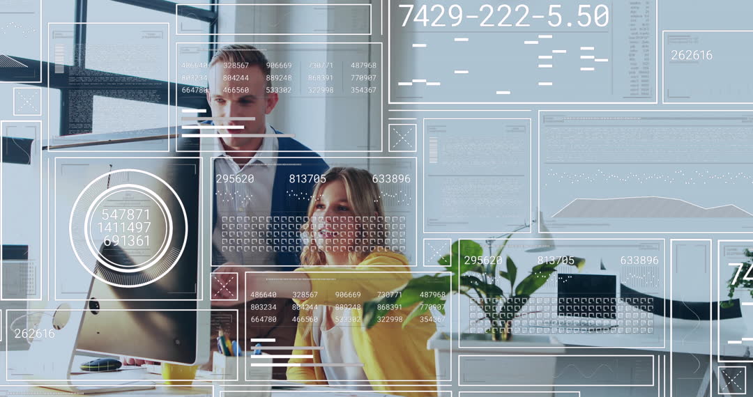 Business team working together in office with digital data processing graphics overlay representing teamwork and modern technology. Useful for illustrating themes of collaboration, digital transformation, and data analysis in business settings.