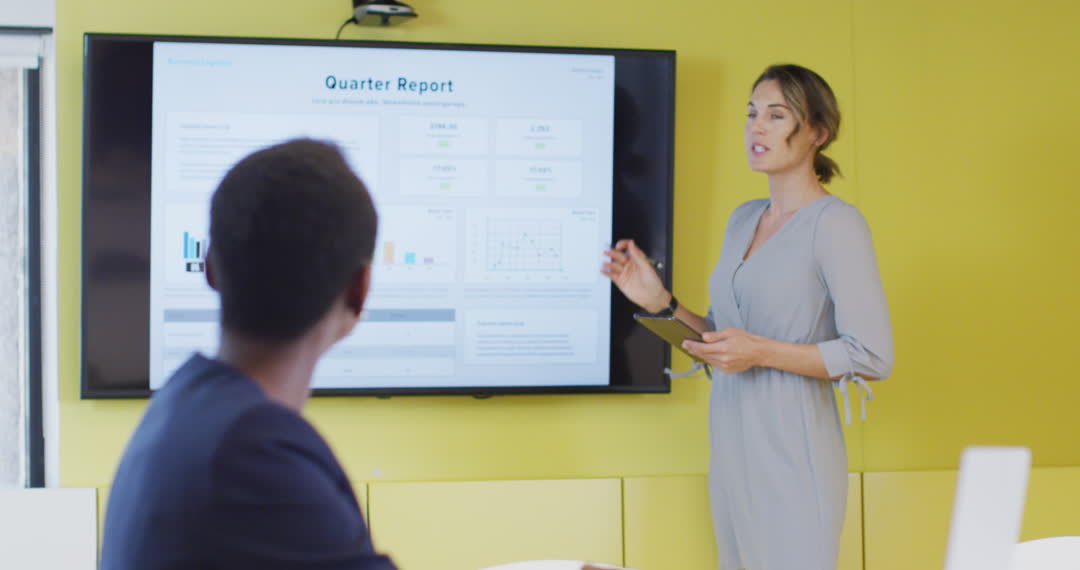 Professional business environment depicting focus, leadership, and teamwork as a Caucasian businesswoman stands presenting quarterly analytics on a screen to her African American coworker, highlighting collaboration and effective communication. Useful for themes involving diversity in the workplace, corporate presentations, leadership, professional planning, and office dynamics.