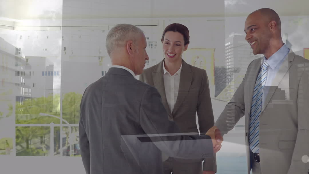 This video shows a diverse team of business professionals exchanging a handshake in an office with a cityscape visible in the background. The blending of a city setting suggests themes of global business and corporate dynamism. It is useful for illustrating concepts such as collaboration, partnership, success, and professionalism within business-oriented contexts, professional networking, team building, or in presentations related to corporate strategy.