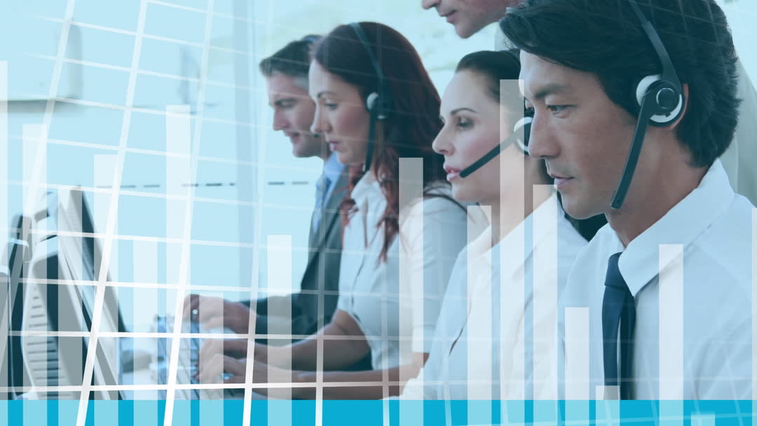 Group of professionals wearing headsets work collaboratively in modern office environment, coupled with animated graph overlay representing data, growth, or performance. Ideal for themes related to customer support, business analytics, technology in business, and global communication strategies.