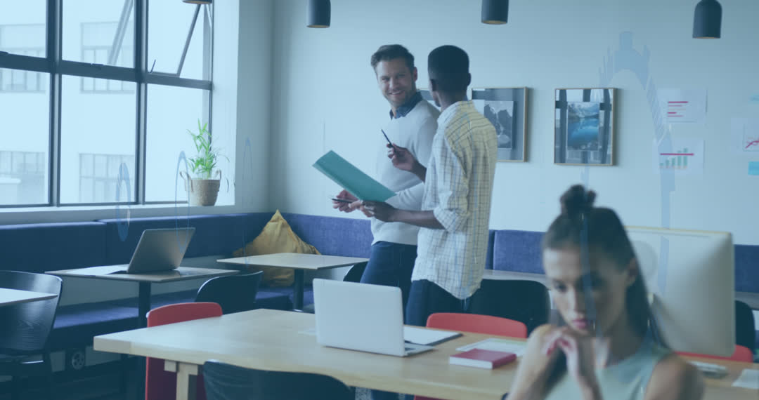 Image shows diverse team of business professionals engaged in discussion in a modern office setting. Overlaid animation illustrates data processing and digital interface elements, suggesting innovation and technology-infused work environment. Ideal for depicting modern corporate culture, teamwork, and tech-driven business solutions for advertising, presentations, and business-related content.