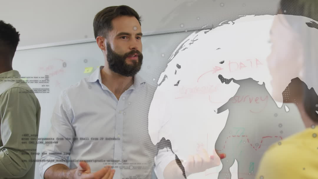 Business professionals engage in discussion in a modern office, complemented by an animation of data processing and a globe overlay. Ideal for illustrating concepts related to global communication, technological advancement in the workplace, or collaborative business environments.