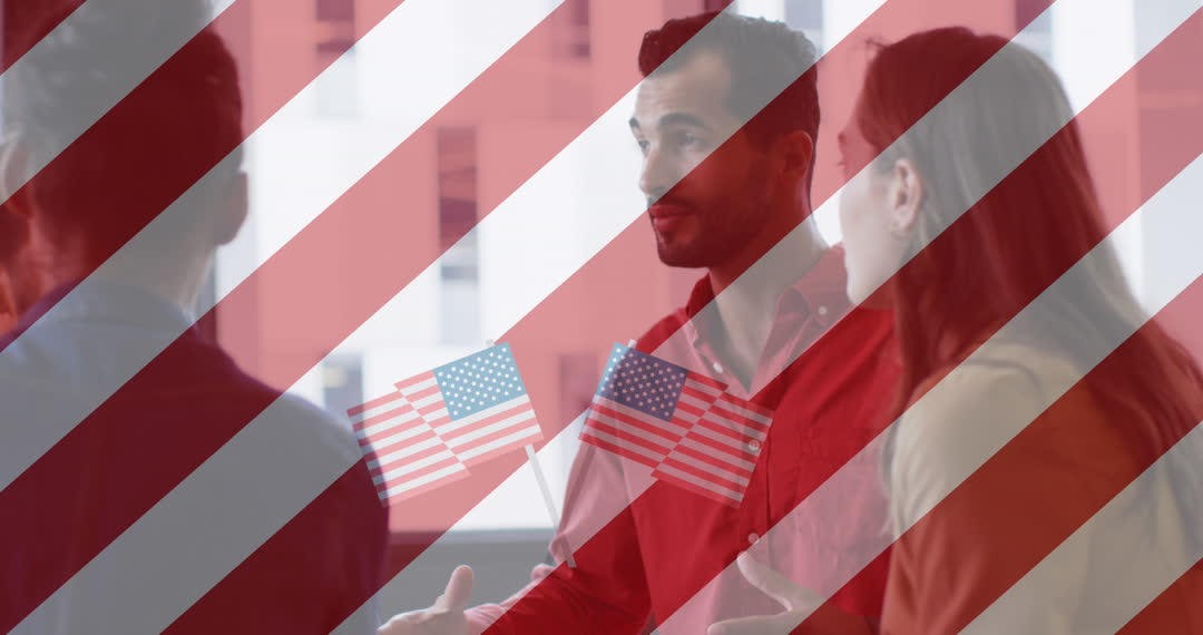 American flags layered over a business team engaged in conversation. Ideal for discussions on multicultural business environments, corporate America, or U.S. Across global business settings.
