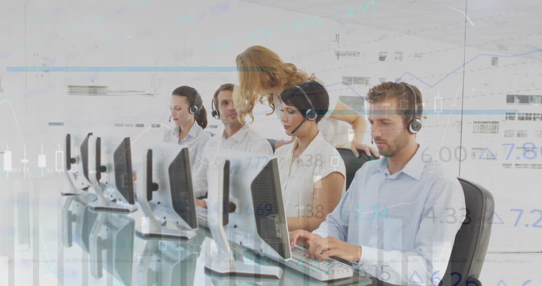 A group of diverse business professionals with headsets sits in an open office environment, engaged in collaborative work with digital data overlays in the scene. This scene portrays a modern, technology-driven workspace focused on data analysis and customer service projects. Useful for illustrating themes of digital coordination, international business strategies, and progressive corporate solutions.
