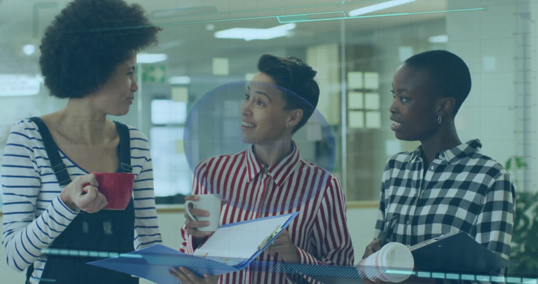 This video shows a group of diverse women in a modern office discussing and smiling, illustrating positive teamwork and communication. Perfect for illustrating corporate culture, diversity initiatives, women in business, marketing materials, and workplace collaboration content.