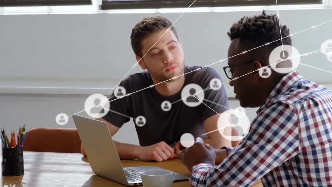 Diverse businessmen sitting in a modern office engage in discussing work-related topics while digital network icons overlay the scene, symbolizing connection and collaboration. Ideal for illustrating concepts related to digital communication, global business networking, team collaboration, technology development, and innovative business solutions. Useful for marketing, business publications, technology articles, or presentations on productivity and digital strategy.