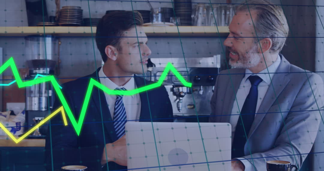 Two businessmen are collaborating and shaking hands while seated at a cafe with laptops open, engaging in a business discussion. The video is overlaid with animated financial graphs and statistical data, emphasizing communication and digital technology in modern business collaboration. Useful for depicting business partnerships, data-driven projects, and financial strategy themes.