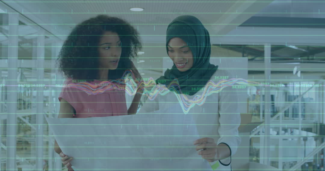 This digital video combines business elements, showing two diverse women collaborating over some plans in a corporate office environment with animated financial graphs superimposed. It illustrates themes of teamwork, strategy, and technology, highlighting the integration of business development and data analysis. This compelling visual is ideal for representing modern business, seminars in strategy planning, and articles on diversity and innovation in corporate settings.