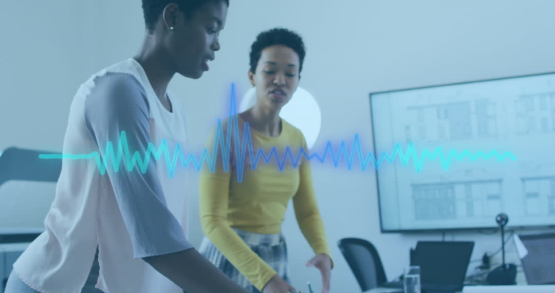 This portrays two businesswomen engaged in analyzing sound information in a collaborative office setting. The video is enriched with a visual of a frequency analyzer, emphasizing a technological focus. Ideal for illustrating themes of diversity in tech, teamwork, or innovating office environments. It can be used for business, technology, or educational purposes, highlighting the integration of modern technology in day-to-day business operations.