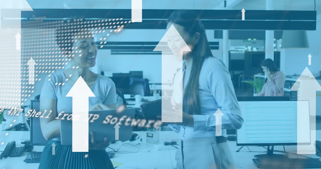 Image shows diverse female coworkers engaging in conversation with digital assets such as arrows and a world map suggesting global business growth and technological innovation. Ideal for use in business articles focusing on modern office environments, diversity, global markets, and technological advancements.