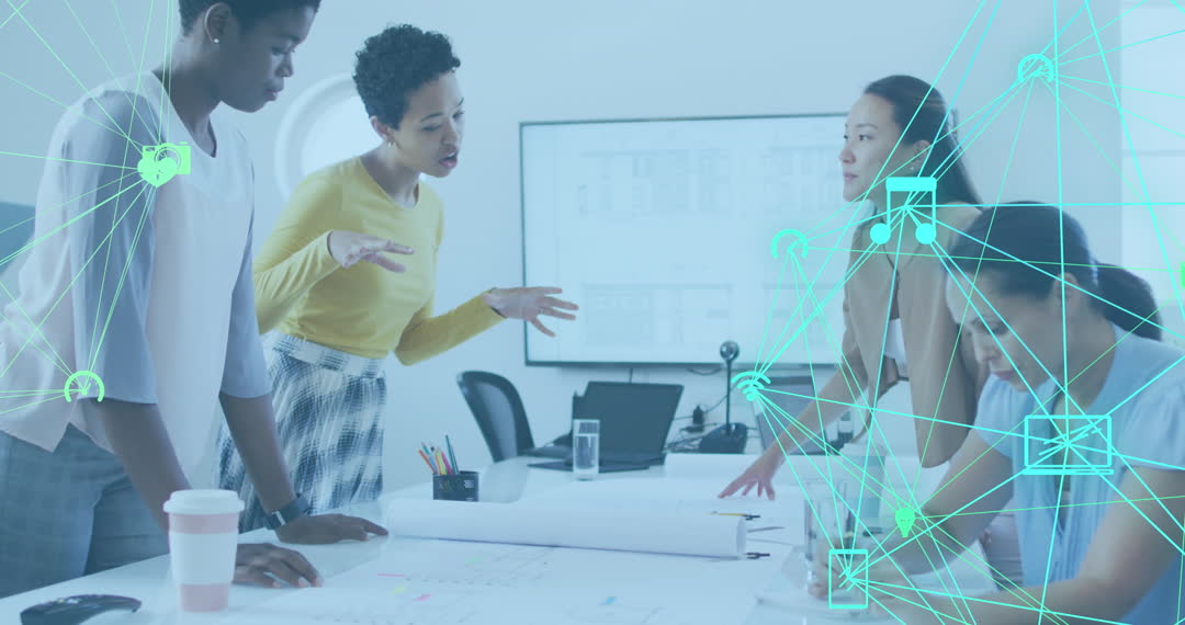 Group of diverse businesswomen engaged in a dynamic office discussion surrounding global digital strategies. Overlay of digital icons represents concepts of international connectivity and technology integrations. Useful for depicting modern business, collaborative brainstorming sessions, and innovative digital solutions in global markets.