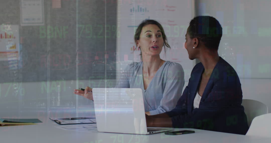 Two female coworkers are seen engaged in discussion with financial data and graphs digitally superimposed. This video captures the dynamic interplay between technology and human interaction in a business environment, highlighting concepts of teamwork, diversity, and innovation. Ideal for use in projects related to workplace dynamics, business finance, and modern office design.