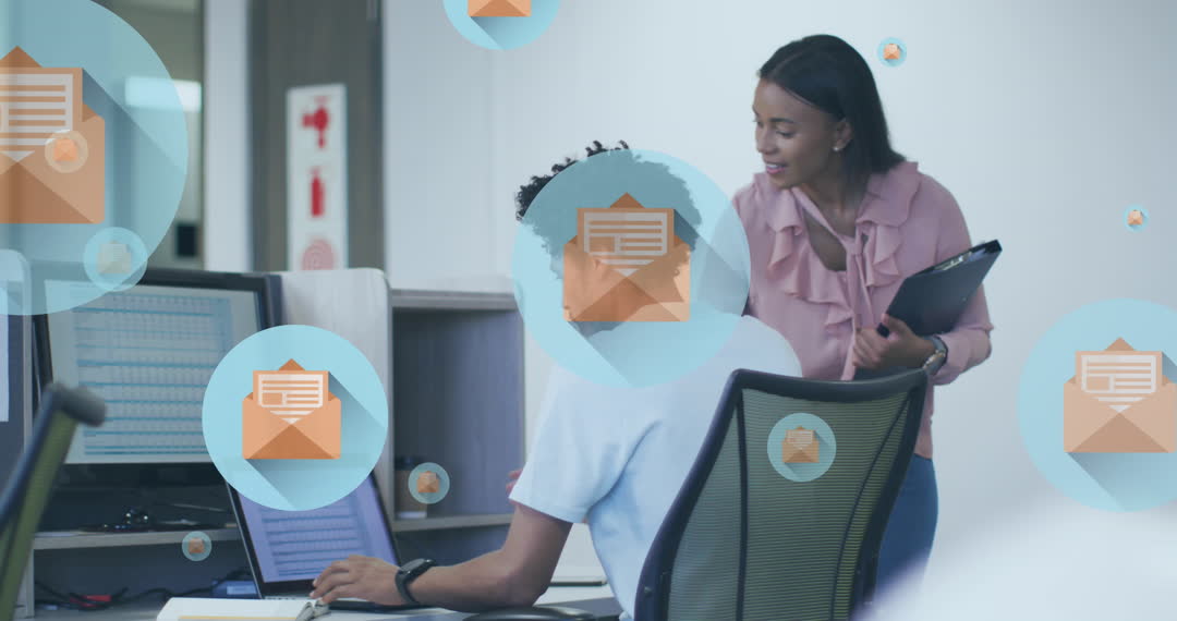 Two diverse businesswomen are engaged in conversation, overlaying digital icons symbolizing communication and data processing in a modern office environment. This can be used to illustrate themes of digital transformation, teamwork in contemporary business practices, or the integration of technology in workplace communication, useful for corporate presentations or promotional materials.