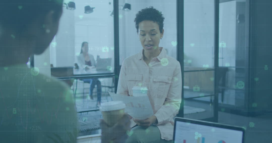 - Diverse Businesswomen Discussing Strategy with Digital Overlay