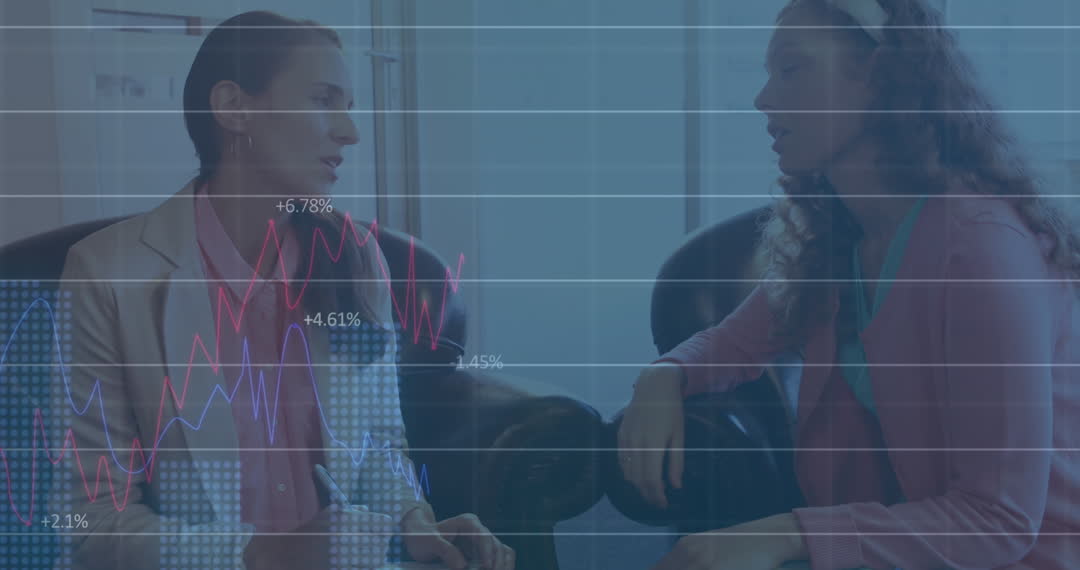 Two diverse female colleagues are engaging in a strategic discussion in an office while a financial graph overlays. Ideal for illustrating women in business, collaborative teamwork, and corporate decision-making alongside data analysis. Useful for business consultation visuals, diversity in tech, or finance-related content.