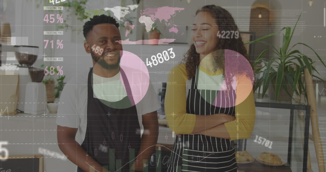 Depicting two café staff members wearing aprons who are smiling, with an overlay of animated data. This conceptual blend of hospitality and technology can be useful for business presentations, digital technology articles, or websites focusing on data integration within the food service industry.