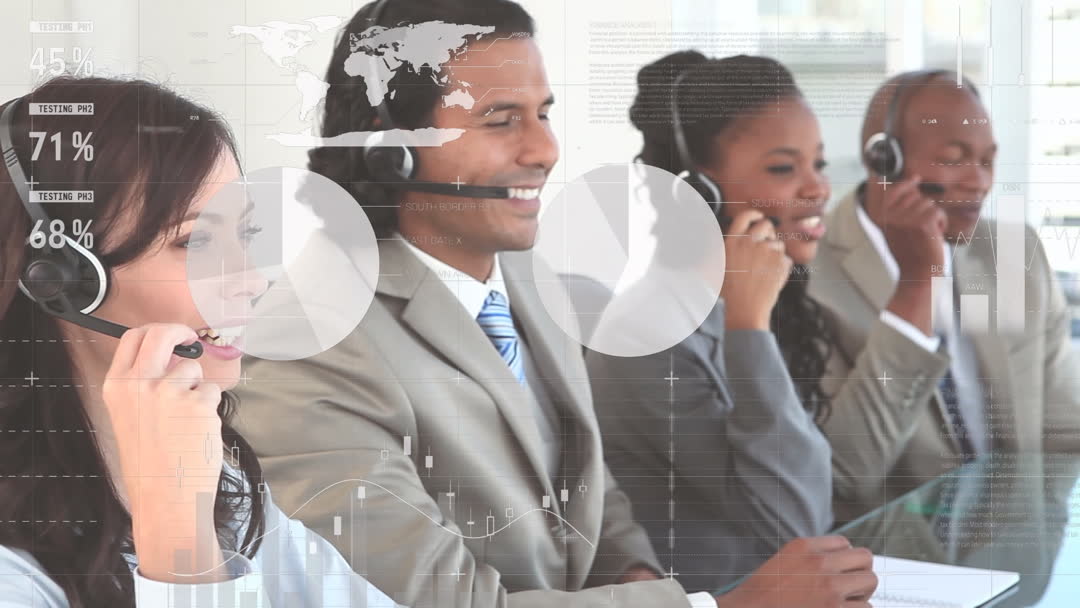 Several professionals are working in a call center, wearing headsets and interacting energetically, overlaid with digital graphs and data elements suggesting technological integration. This can be used in articles or presentations focusing on modern communication technology, effective customer service strategies, or teamwork diversity in corporate environments.