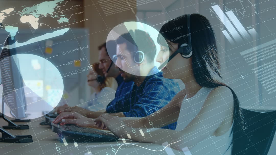 Call center operators in professional consulting environment, illustrated with digital financial graphs. Perfect for enhancing content related to finance, global business operations, customer service, and technological advancements in workplace communication. Suitable for articles, social media, and promotional materials highlighting modern business solutions.