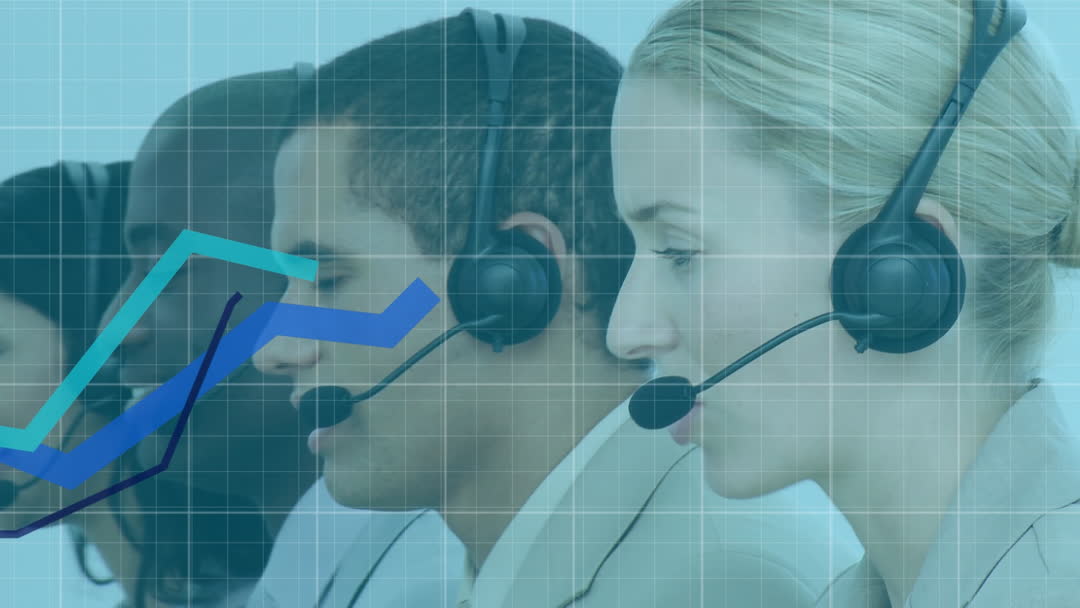 Image shows a diverse group of call center workers wearing headsets, highlighted with financial graphs and data overlays, signifying their involvement in finance or business operations. Ideal for illustrating concepts related to customer support in financial sectors, teamwork in data-driven environments, or call center operations.