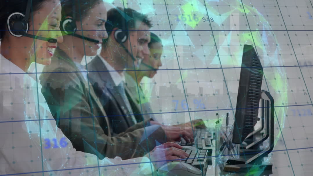 Diverse call center team working at computers with digital overlay of financial data and graphs. Perfect for illustrating concepts of global business operations, financial services, digital transformations, or customer service environments. Useful for websites, marketing materials, or presentations related to business, technology, or finance.