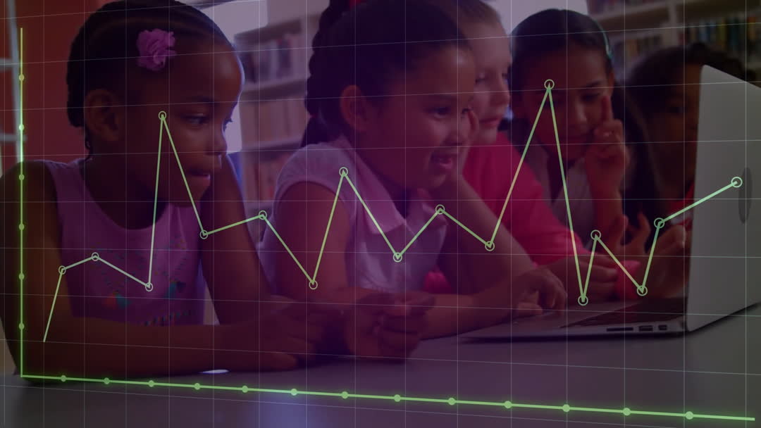 Children sitting together enthusiastically exploring educational content on a laptop. A green digital graph overlay represents interactive or data-driven learning. Ideal for educational technology, online classes promotion, or illustrating teamwork and learning analytics in diverse environments.