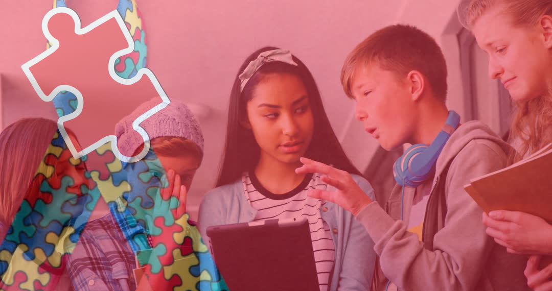 Image shows a group of diverse children interacting around a tablet, with a colorful ribbon and puzzle symbols overlayed, representing autism awareness. The presence of various ethnicities emphasizes inclusion and collaboration in educational activities. The digital aspect highlights technological engagement in teaching about diversity and advocacy for children with autism. Suitable for campaigns promoting autism awareness, educational programs, or materials highlighting inclusivity among young audiences.