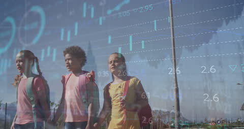 Group of diverse children with backpacks walking along street with transparent overlay of financial graphs and data, representing future trends and economic education. Ideal for advertising education programs, illustrating financial literacy, or linking future generations with economic concepts.