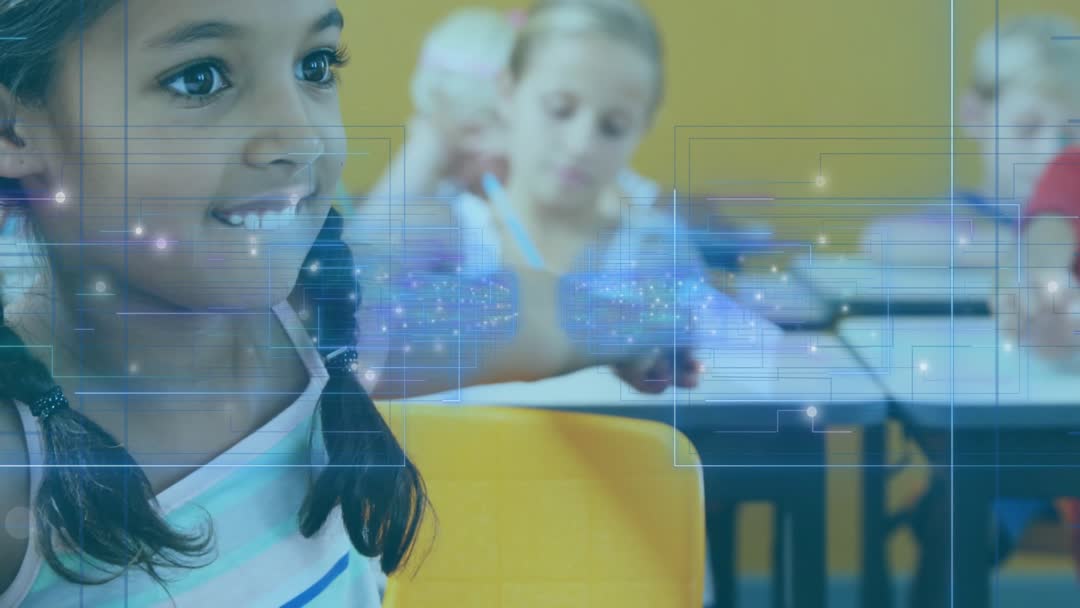 Young children working together in classroom with digital overlays represent education tech integration and collaborative learning environments. It spans multicultural learning, teamwork in schools, and modern education innovation. Ideal for educational institutions and tech-forward educational materials.