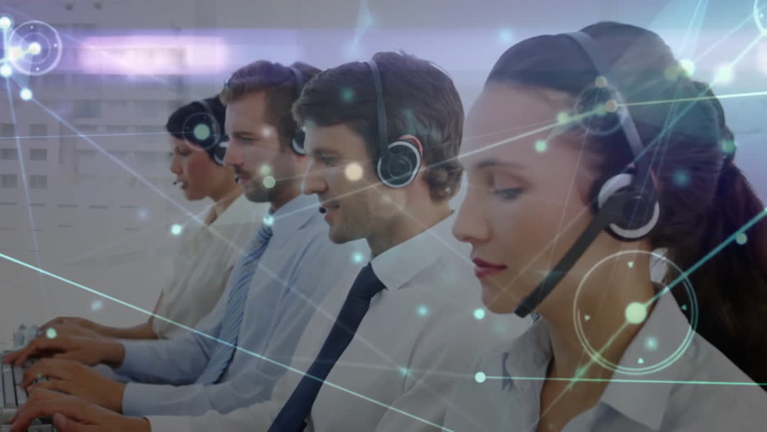 This video shows a team of diverse colleagues working in an office while wearing headsets, emphasizing communication and teamwork. The visual of network connections highlights the theme of connectivity and global communication, making it ideal for illustrating concepts related to customer support, international business, or collaborative work environments. This could be used in promotional materials for customer service or IT companies, blogs about effective communication, or educational content related to global business strategies.
