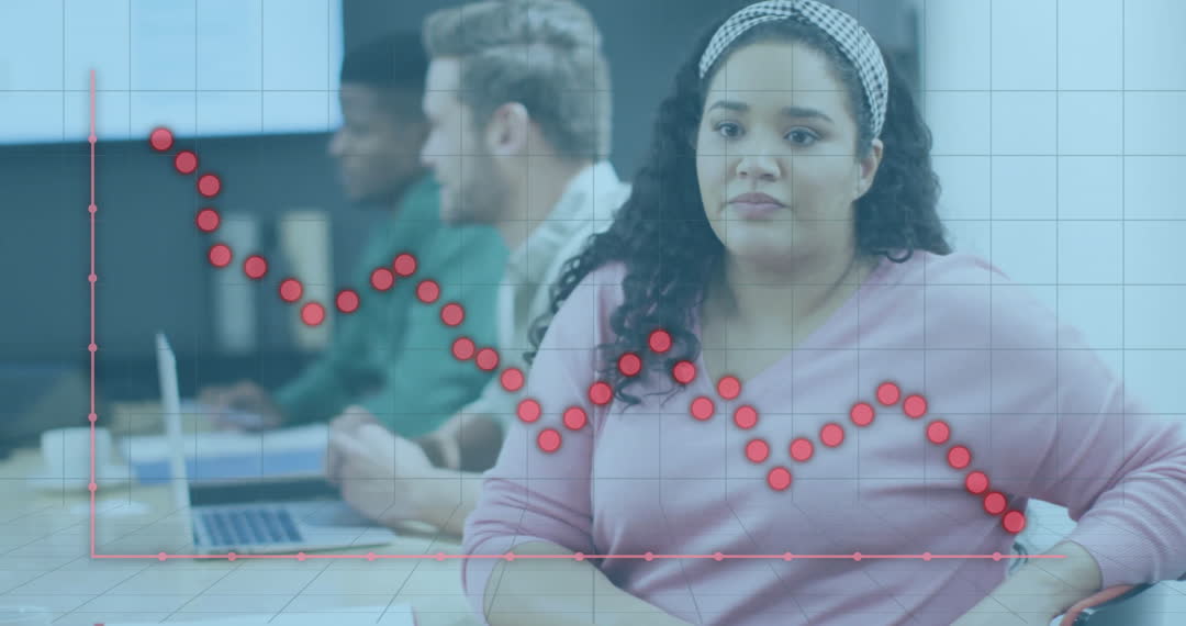 Group of colleagues critically exploring business performance data visible through a superimposed red line graph. Ideal for articles or content focused on workplace diversity, data-driven decision-making, business environment, or analytical team processes.
