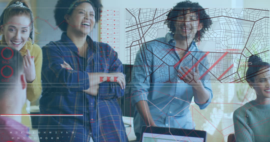 Group of diverse colleagues in an office environment engaging with digital data overlay. Suitable for illustrating teamwork, modern business, data-driven culture, and office collaboration in technology-driven industries. Highlights diversity and positive workplace dynamics.