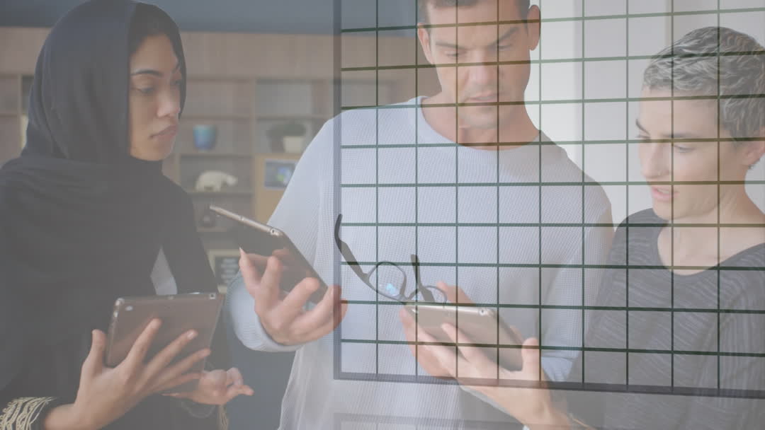 Diverse Colleagues Analyzing Data with Technology Overlay Video