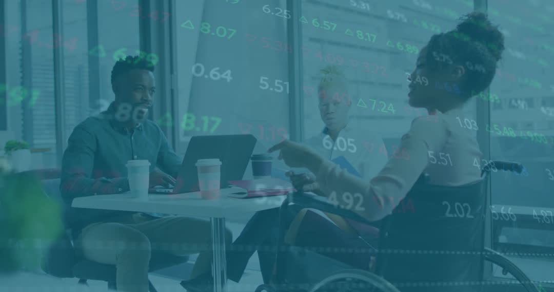 Group of coworkers from diverse backgrounds collaborating in a modern office. Financial data overlay suggests focus on finance, business strategy, or we could suggest trends for economy-related usage. Ideal for illustrating concepts of teamwork in business settings, financial analysis, or entrepreneurship.