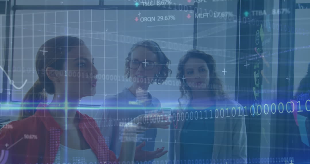 This scene shows diverse female professionals engaged in an animated brainstorming session, with a dynamic data interface projected over the video, highlighting a modern tech-driven environment. Ideal for showcasing teamwork, diversity in technology, and the integration of digital solutions in business contexts.