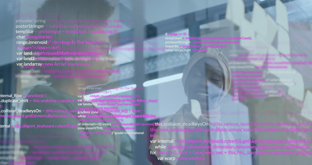 Two professionals collaborating and discussing ideas while surrounded by digital code overlay in a modern office environment. This video represents teamwork, innovation, and technology in a diverse workplace. Useful for articles or websites focusing on inclusive workspaces, software development, or digital communication strategies.