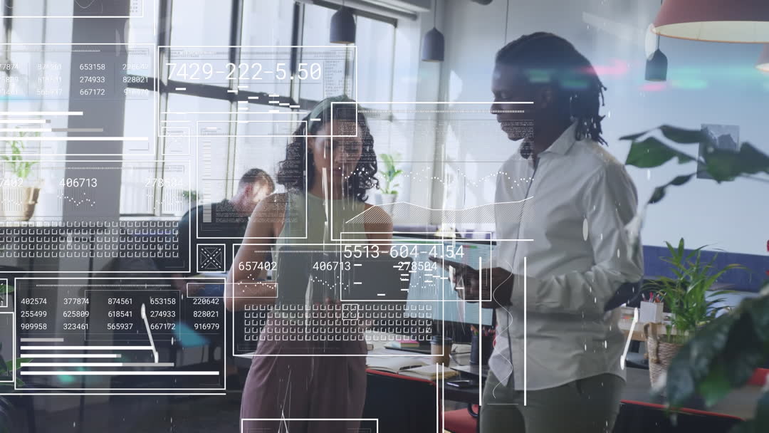 Two diverse colleagues in a modern office discuss while a futuristic overlay of financial data is visible. Suitable for themes related to business collaboration, digital transformation, technological advances in finance, diverse workplace settings, and global office environments.